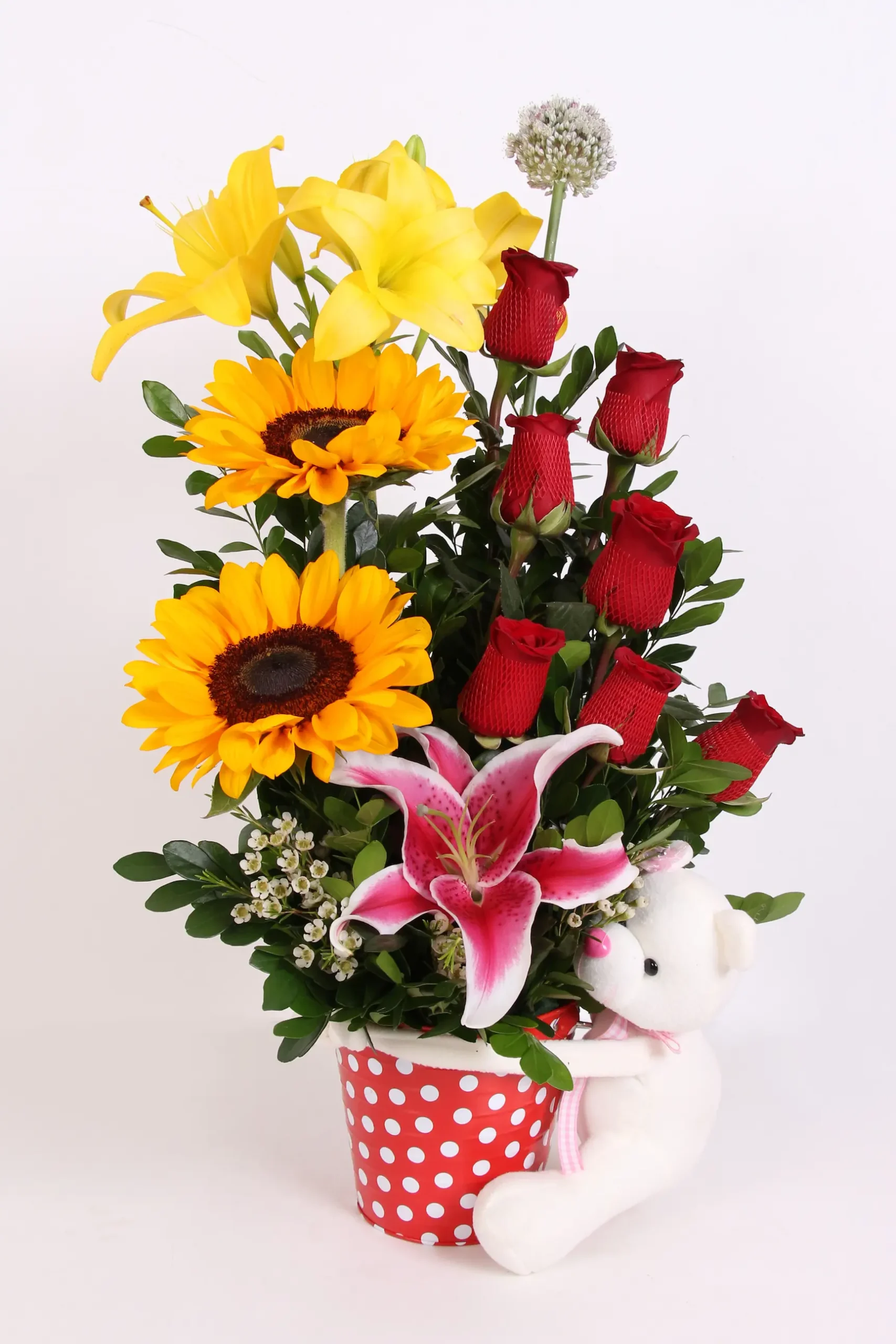 Base de metal, peluche, 7 rosas, 2 girasoles, lirio y flor de ajo
