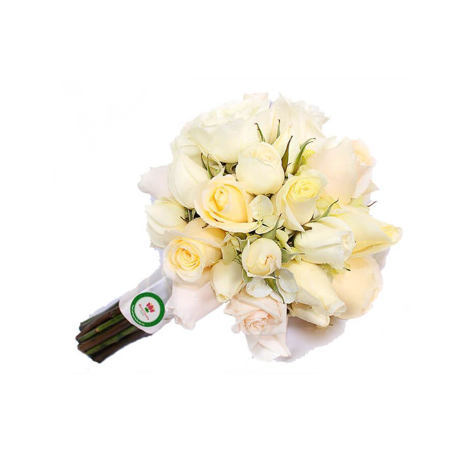Bouquet hecho con 36 rosas blancas, hortencia y cinta de organza.