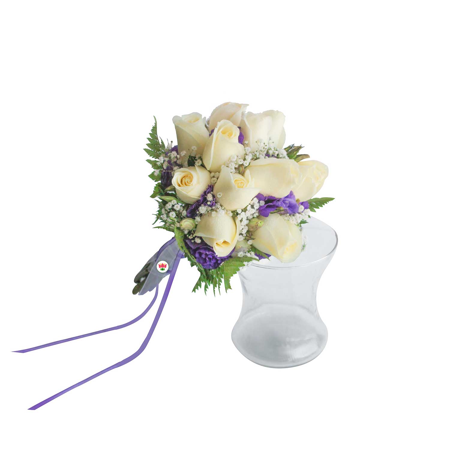 Bouquet hecho con rosas blancas y adornado con helecho cuero, wax y cinta morada.