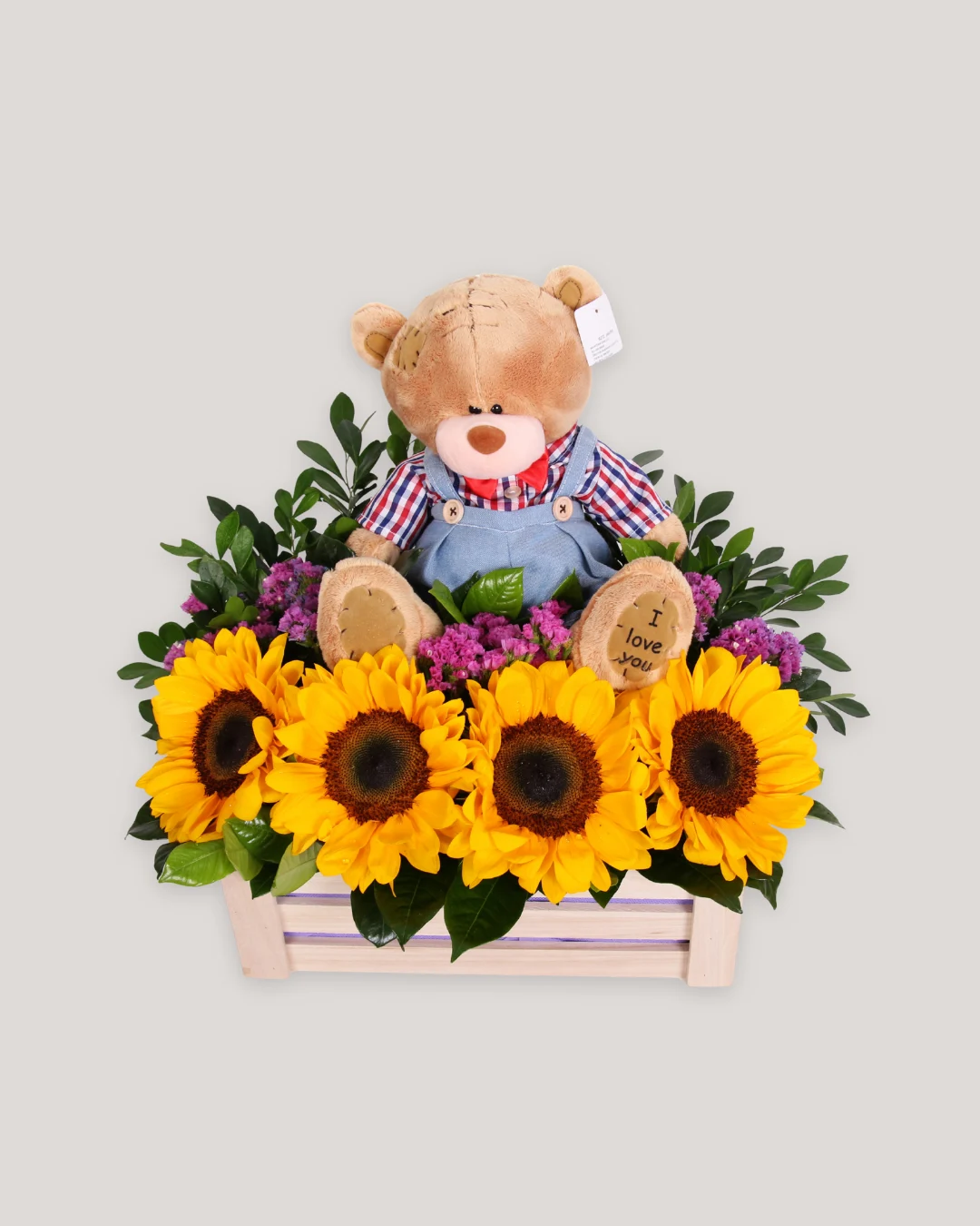 4 girasoles, jaba de madera y peluche