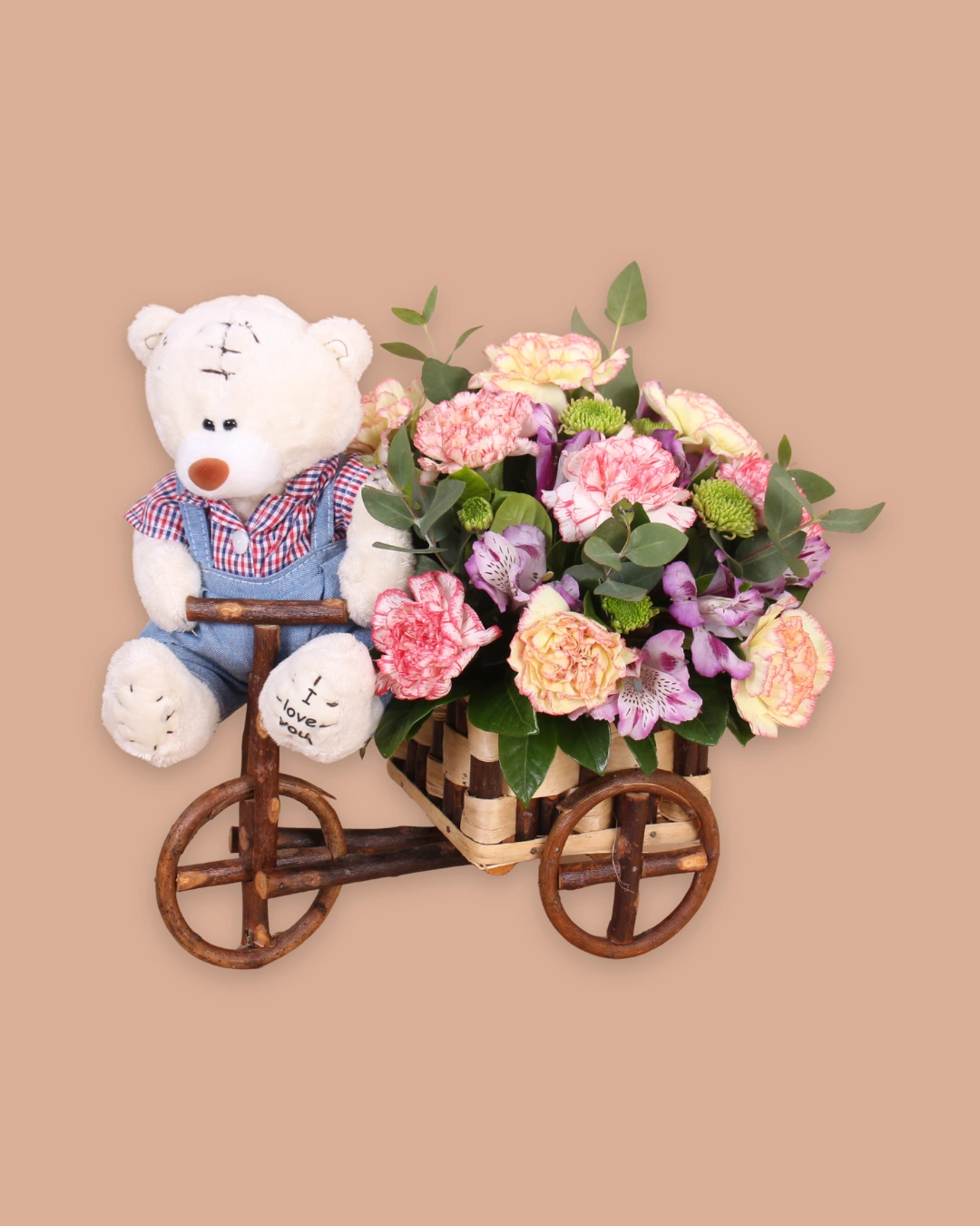 12 Claveles, astromelias, variedad verde y peluche de osito Medidas: 35cm x 40 cm