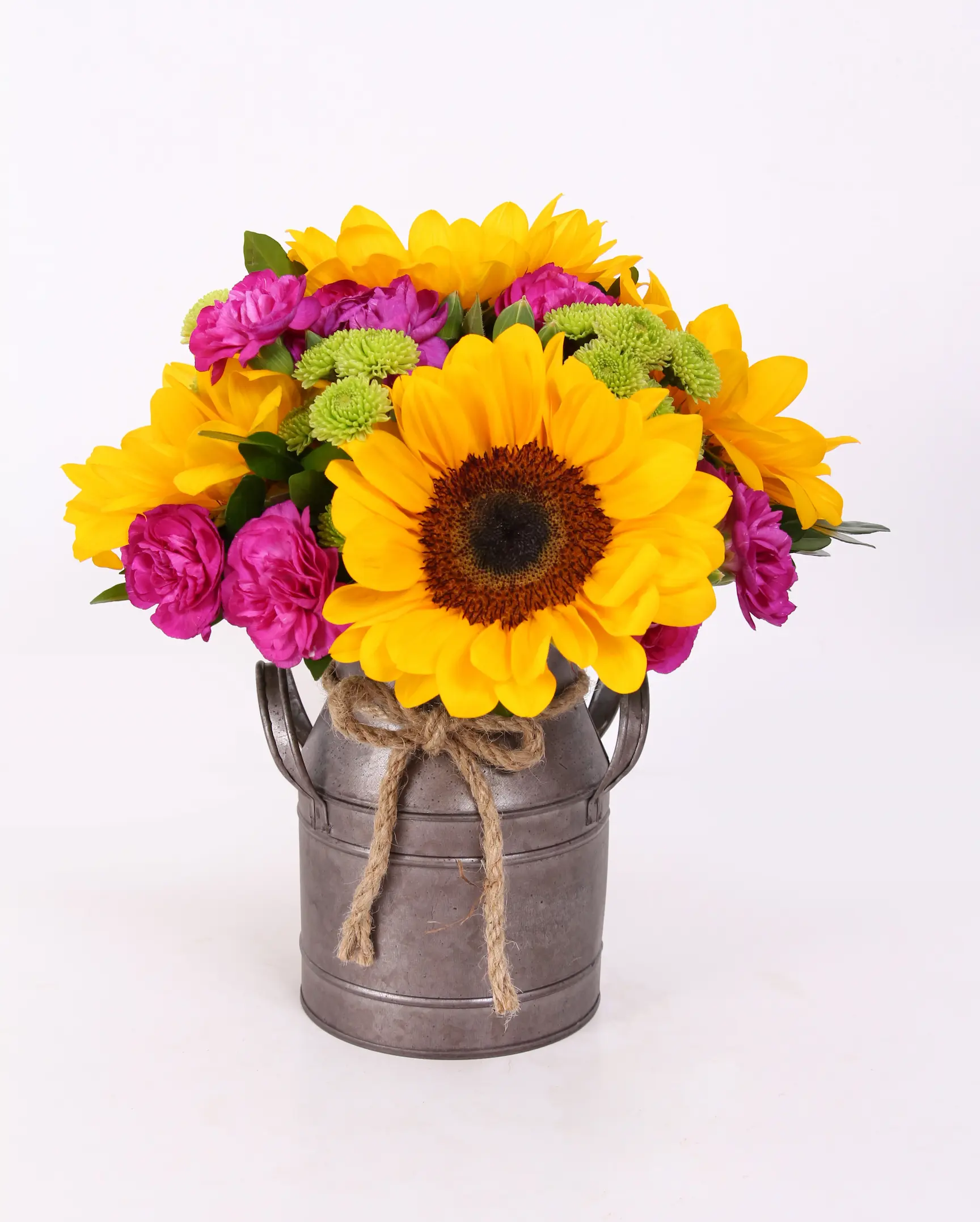 Lechería de metal, 5 girasoles y claveles