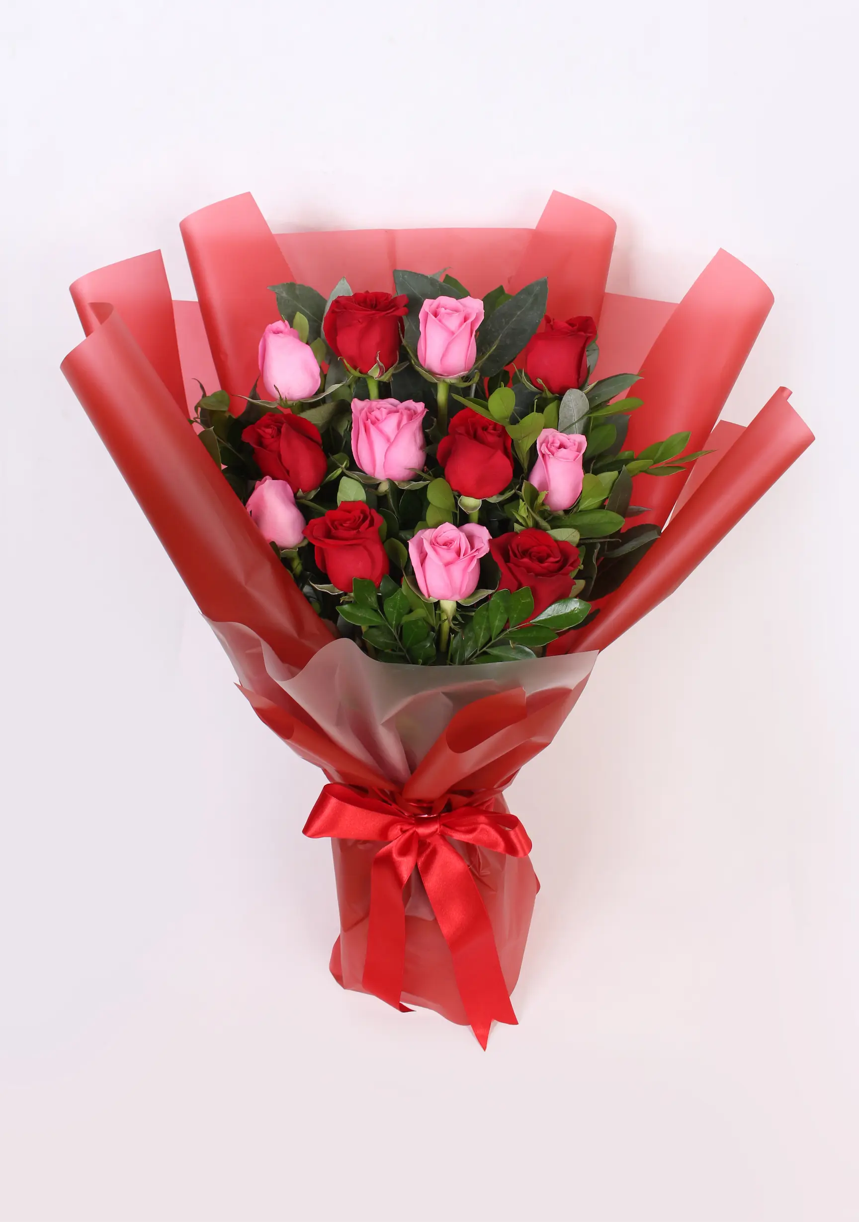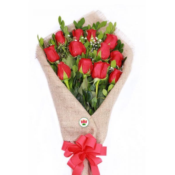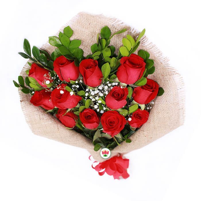 Ramo compuesto por 12 rosas rojas y decorado con follaje variado, envuelto en tela Notex e incluye un lazo de cinta satinada,